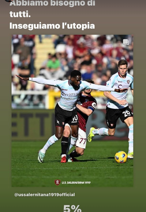 “Abbiamo bisogno di tutti, inseguiamo l’utopia. 5%“. Così il dg della Salernitana Walter Sabatini ha commentato in una storia sul proprio profilo Instagram il pareggio della Bersagliera a Torino per 0-0.
